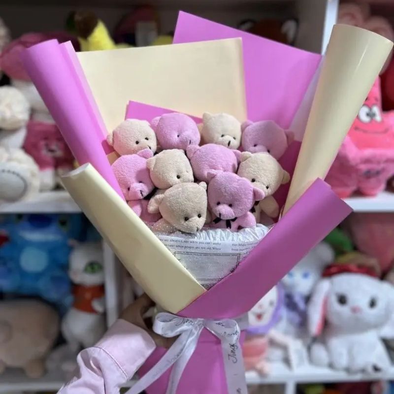 بوکت خرسی صورتی یکی از خاصترین و زیباترین ایدههای هدیه برای مناسبتهای عاشقانه و جشنهاست. این بوکت شامل عروسکهای خرسی کوچک و نرم در رنگهای صورتی و کرم بوده که با چینشی فانتزی در کاغذ رنگی شیک و روبان تزیین شده است.